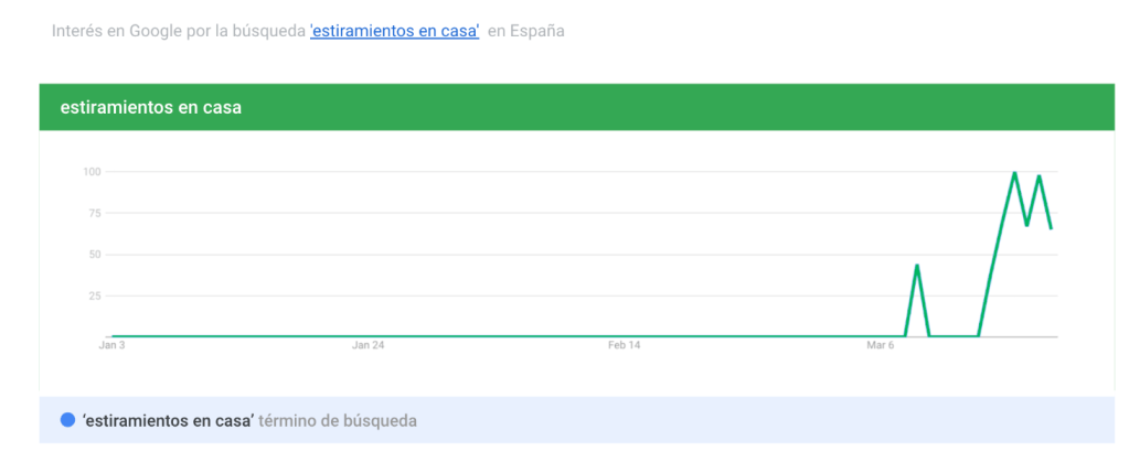 Cuidados personales. Los usuarios buscan información e ideas para mantenerse sanos física y mentalmente. Por ejemplo, en el Reino Unido ha aumentado el interés de búsqueda por “esterillas de yoga” (“yoga mat”) y, en España, por ejercicios para meditar (“meditación”).